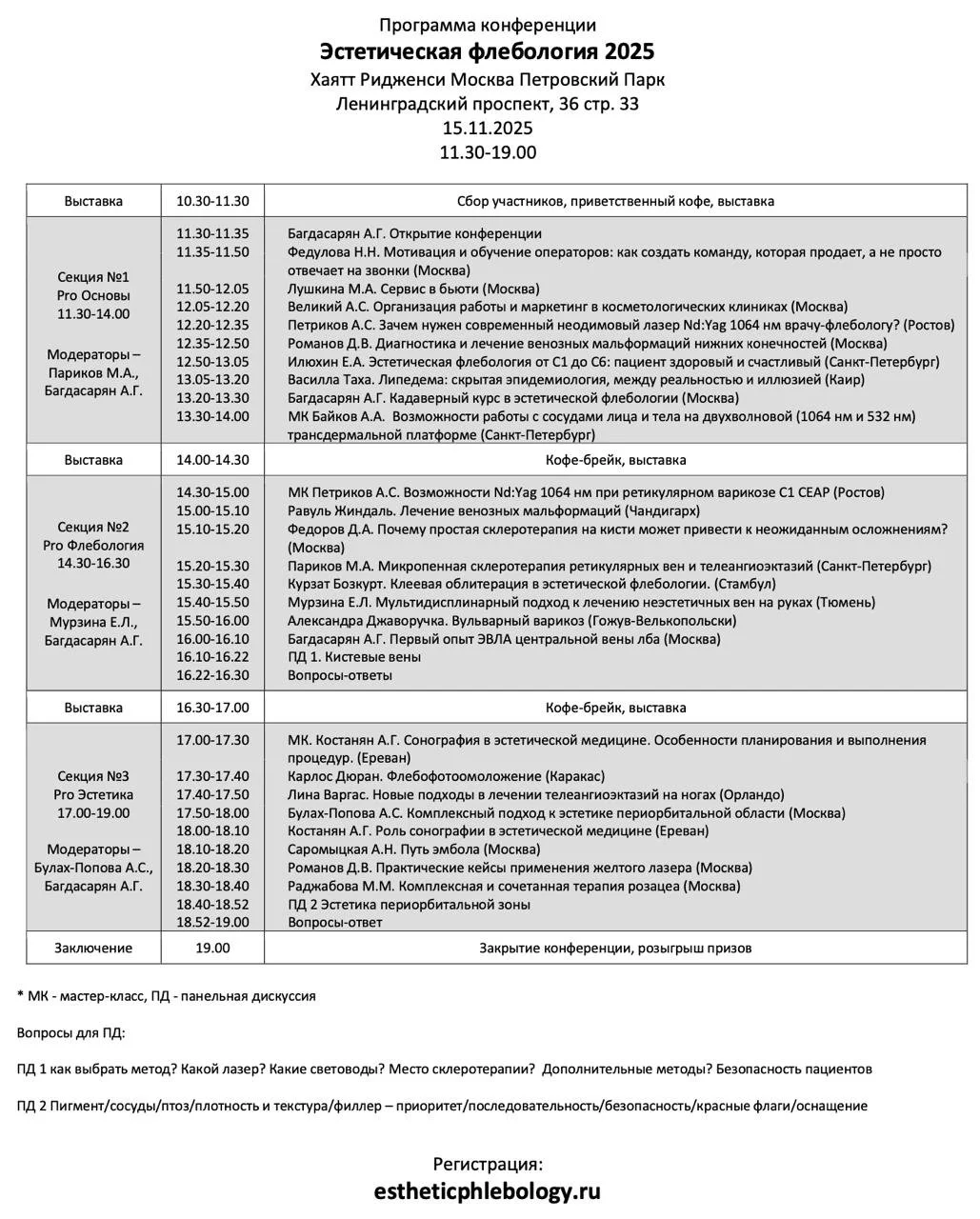 Под термином «эстетическая флебология» оргкомитет понимает все современные малотравматичные малоинвазивные методы лечения и коррекции варикозной болезни, ретикулярного варикоза, телеангиоэктазий, неэстетичных сосудов, поверхностных мальформаций и гемангиом независимо от локализации.
